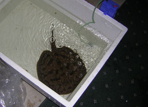 Procedure Keeping the dissolved oxygen levels high and the temperature constant are the two most important factors involved in this process. If you are moving your ray a short distance (less than one hour), it can be transported in its regular tank water. If the trip takes longer than a few hours, you will need to do a bit more prep work. Fill a couple of buckets with fresh water from the tap, treat it with the dechlorinator, and aerate it overnight to ensure maximum DO concentration. Do not feed the ray at least 24 hours before the trip -- you don't want the bag fouled up with excess feces, especially if you are planning a long-distance move. The best type of net to invest in is a fishing net with rubber mesh and a long handle. This will prevent the ray from becoming entangled and reduce stress to the animal. Once you've equalized the temperatures between the tank and the transport container, net the ray and place it directly into the container. Acclimation is very similar to the procedures used with other fish. Either float the bag, or maintain a slow drip of water via siphon from the new tank to the transport container (Figure 1).