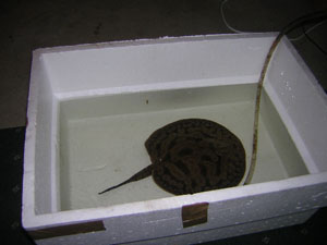 Biology: Husbandry: Safety Concerns Despite the potential dangers posed by their venomous spines, stingrays are generally peaceful creatures, and if you treat them with respect and take the proper precautions while interacting with them, you should not need to worry excessively about being stung. But on rare occasions, accidents do occur regardless of how careful we are. For this reason, I would strongly recommend reading through the following article on the management of stingray envenomations, just in case. It might also be a good idea to print out a copy of it and keep it by your aquarium at all times, as your local emergency room staff might not be familiar with exactly how to handle a stingray envenomation.
